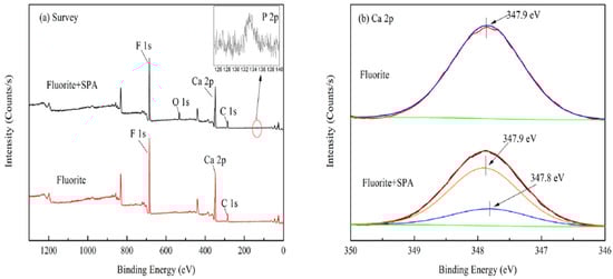 Survey spectra (a) and Ca 2p high-resolution spectra (b) of fluorite and fluorite treated with SPA.