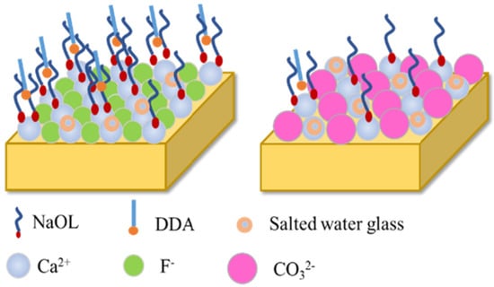 Unlike the combined collectors from sodium oleate and oleamide (anionic/nonionic), sodium oleate and dodecylamine (DDA) is an anionic/cationic combination collector. The flotation separation of fluorite from calcite can be achieved using a mixed collector (NaOL:DDA = 9:1) and salted water glass as a depressant. At pH 11, with 1 × 10−4 mol/L combination collector and 2 × 10−3 mol/L of salted water glass, the recovery of calcite is less than 20%, and the recovery of fluorite is kept at about 85%. The FTIR measurement results showed that NaOL and DDA were co-adsorbed on the surface of fluorite, whereas only NaOL was adsorbed on the surface of calcite. The wettability analysis results showed that salted water glass hinders the adsorption of mixed collectors on the surface of calcite and selectively inhibits flotation [12]. The adsorption model of the mixed collector NaOL/DDA on the mineral surface is shown in Figure 7 [12].