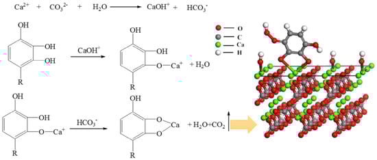 Tannic acid as a calcite flotation depressant is widely used in the beneficiation of fluorite [95,96]. Adsorption tests indicated that tannic acid adsorption onto calcite was highly dependent on solution pH, and the optimal adsorption pH value was 7–8. At this pH value, tannic acid can selectively adsorb on the calcite surface and prevent the adsorption of sodium oleate, whereas this phenomenon does not exist on the fluorite surface. The chemical shifts of tannic acid adsorbed on the calcite surface were more similar to those of a Ca(OH)2 surface than those of a fluorite surface, suggesting that tannic acid selectively adsorbs on the calcite surface via chemical interactions with Ca(OH)+. The proposed adsorption process and model for tannic acid are shown in Figure 8 [96].