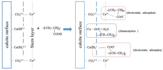 Polyaspartate (PASP) is another efficient selective depressant for flotation of fluorite from calcite [97,98]. The addition of PASP can hinder the adsorption of NaOL on the calcite surface but exert little influence on its adsorption on fluorite surface. Similar to PASP, polyacrylic acid (PAA) is also a highly selective depressant of calcite [70]. The flotation tests indicated that the preferential adsorption of PAA onto calcite, rather than sodium oleate, could selectively depress the flotation of calcite, allowing its separation from fluorite at a pH of 7. The mechanism of selective adsorption can be explained by the chemical bonding between the carboxyl group of PAA and the hydroxyl groups of the Ca species on the calcite surface, modifying the structure of the adsorbed layer. The proposed models for the adsorption of PAA on the calcite surface are shown in Figure 9 [70].