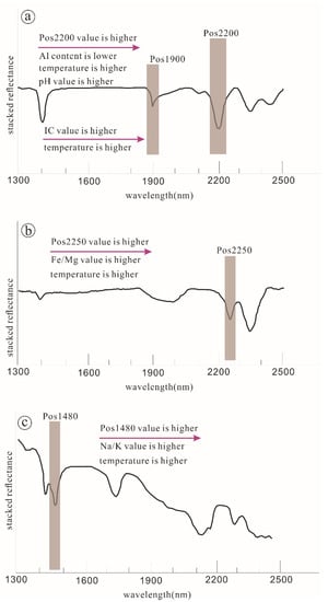 Illite crystallization (IC) is a terminology proposed by Kübler (1967) [54], which refers to the ratio of Pos2200 peak depth to near 1900 nm absorption (Pos1900) peak depth of sericite (Figure 1). IC value can be used to indicate the formation temperature of sericite. The higher the IC value, the less water content the mineral contains and the higher the formation temperature [2]. The shift of Pos2200 reflects the substitution of Si and Al in the tetrahedral and the substitution between Al, Mg, and Fe in the octahedral of the sericite lattice. Pos2200 value decreases with the increase of Al content in the lattice (Figure 2a). The shift of Pos2250 reflects the substitution of Al, Mg, and Fe in the octahedral of the chlorite lattice. Pos2250 value increases with the increase of Fe content in the lattice [55,56,57] (Figure 2b). The shift of Pos1480 reflects the substitution of K and Na in the alunite lattice. Pos1480 value increases with the increase of Na content in the lattice [3,58] (Figure 2c). The REE-bearing mineral absorption features reflect rare earth element anomalies and protolith variations. In addition, there are also extensive substitutions of interlayer ions and trace elements such as Ti, Sr, Mn, Pb, and Zn, and their substitution characteristics can be obtained by LA-ICP-MS and EPMA in situ micro-regions.