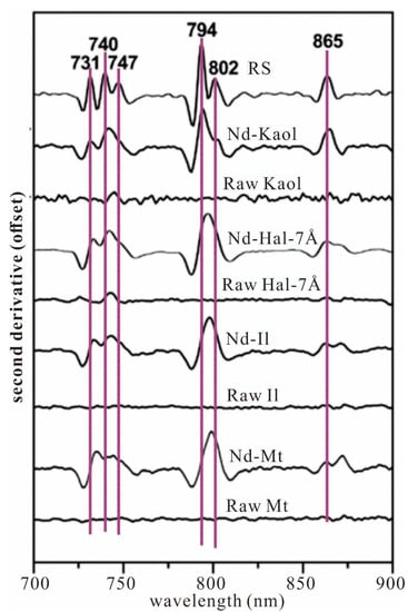 Secondary derivative reflectance spectra in the range of 700–900 nm (modified from [42]). RS—sample from the Renju REE deposit with a total REE concentration of 3340 ppm; Nd-Kaol—kaolinite with Nd content of 666.6 ppm; Raw Kaol—kaolinite with total REE concentration of below 50 ppm; Nd-Hal-7 Å—halloysite (7 Å) with Nd content of 1112.6 ppm; Raw Hal-7 Å—halloysite (7 Å) with total REE concentration of below 50 ppm; Nd-Il—illite with Nd content of 1154.0 ppm; Raw Il—illite with total REE concentration of below 50 ppm; Nd-Mt—montmorillonite with Nd content of 1087.3 ppm; Raw Mt—montmorillonite with total REE concentration of below 50 ppm.