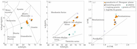 Variation diagram of the major elements in the Zhouguan granodiorite. (a) Diagram of Na2O + K2O vs. SiO2; (b) diagram of K2O vs. SiO2; and (c) diagram of A/NK vs. A/CNK.