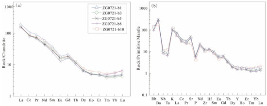 Chondrite-normalized rare earth elements diagram (a) and primitive mantle-normalized spider diagram for trace elements (b) of the Zhouguan granodiorite (the normalized values according to Sun and McDonough, 1989 [52]).