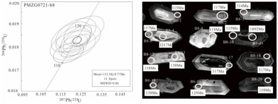 In recent years, with the advance and application of high-precision isotope dating technology, a lot of isotopic chronology studies on the Early Cretaceous granites in Jiaodong were performed [6,66,67,68,69,70]; however, the data on the ages of Zhouguan granodiorite are very few [71]. In this study, a systematic LA-MC-ICP-MS dating of the Zhouguan granodiorite was carried out and its age was determined as 115 Ma, which represents the emplacement time of the Zhouguan granodiorite.