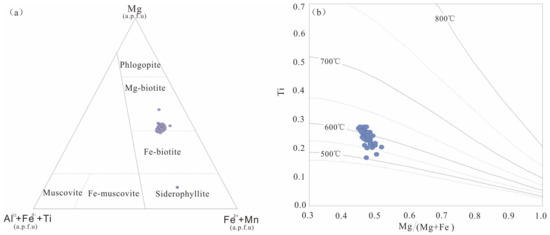 Classification diagram of biotite from the Zhouguan granodiorite (a) and Ti vs. Mg/(Mg + Fe) plot of biotite (b) (after Foster, 1960 [57]; Henry et al., 2005 [58]).