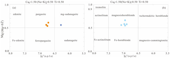 The main characteristics of amphibole in the Zhouguan granodiorite are as follows: The SiO2 content is in the range of 42.27%~46.38%, and the MgO content is 10.44%~13.35%, which is obviously Mg-enriched (Table 5). The Al2O3 content is 5.79%~10.93%, FeOT content is 14.46%~17.76%, and CaO content is 10.74%~111.51%. Therefore, the amphibole belongs to Ca-amphibole (Caa > 1.50), which can be further subdivided into magnesiohornblende, pargasite, and magnesiosadanagaite [59] (Figure 7).