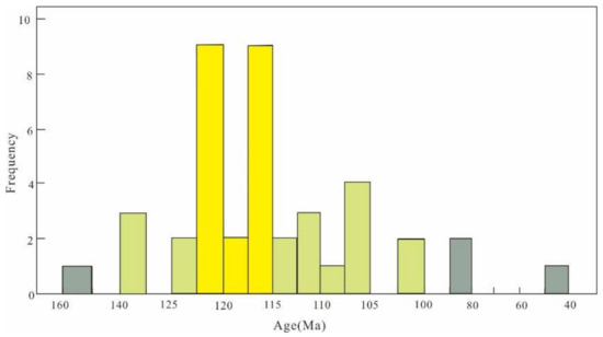 Metallogenetic age statistics of typical gold deposits in the Jiaodong area. (data from [72,73,74,75,76,77,78,83,84]).
