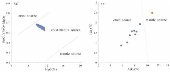 Diagram of Plot of FeOT/(FeOT + MgO) vs. MgO from biotites (a) and diagram of TiO2 vs. Al2O3 from amphiboles (b) (after Jiang and An, 1984 [79]; Zhou et al., 1986 [80]).