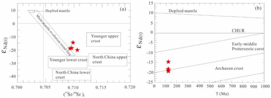 The Zhouguan granodiorites have high initial 87Sr/86Sr ratios (0.710424 to 0.711074) and negative εNd(t) values ( −14.78–−19.95) (Figure 10a), indicating their origination of the continental crust [81,82]. The samples plot in the vicinity of Early–Middle Proterozoic crust and Archaean crust in the εNd(t) vs. T diagram, suggesting the source of Early–Middle Proterozoic and Archaean crusts (Figure 10b). The Sr and Nd isotopic compositions show that magmas originate from the lower crustal basement metamorphic rocks and lithospheric mantle melting [85].