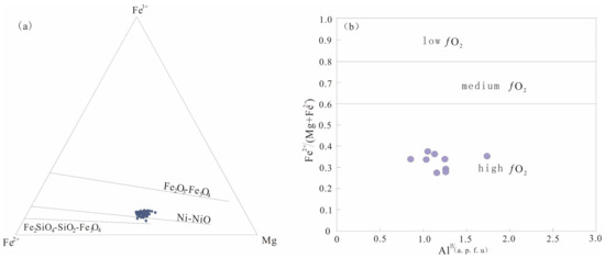 The biotite formula is calculated on a 22 oxygen atom basis. The main characteristics of biotite in the Zhouguan granodiorite are as follows: The SiO2 content in biotite is in the range of 34.28%~36.727% while MgO content is 9.797%~11.635% (Table 4), which means that biotite is significantly rich in Mg; the AlVI + Fe3+ + Ti and the Fe2+ + Mn values are 0.316~0.556 and 1.07~1.27, respectively, with the Fe2+/(Fe2+ + Mg) ratio being 0.26~0.52. This indicates that the biotite was not subjected to late fluid alteration and belongs to primary biotite [53], which is consistent with the observation of biotite under a microscope. On the composition classification diagram of biotite (Figure 6a), both Mg-biotite and Fe-biotite are the main sub-type. The Al2O3 content of biotite is in the range of 13.09%~15.25% and the cation number of AlVI per formula is 0.01~0.114. The high Ti and low AlVI in the biotite formula indicate that the biotite was formed under the conditions of relatively high temperature and high oxygen fugacity [54,55].