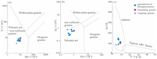 Diagrams of Y vs. tNb (a), Ta vs. Yb (b) and Sr/Yb vs. Y (c) for the Zhouguan granodiorite (after Pearce et al., 1984 [91]; Martin et al., 2005 [92]).