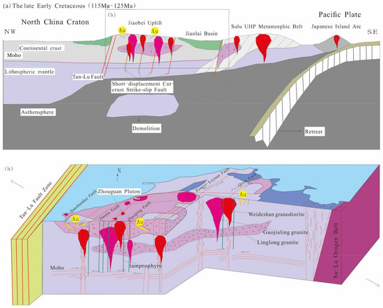 Geodynamic mechanism of magmatic activity (a) and diagram showing a structural pattern in Jiaodong (b) (after Song et al., 2020 [82]; Yu et al., 2018 [99]).