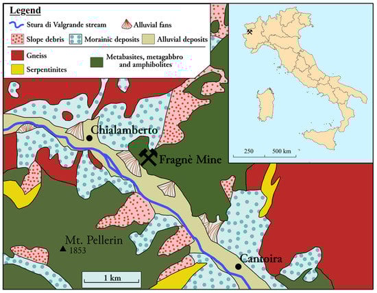 Geographical and geological sketch map of the Fragnè mine (Lanzo Valley, Western Alps). Modified after Foglio 41 Gran Paradiso (http://sgi.isprambiente.it (accessed on 22 June 2022)).