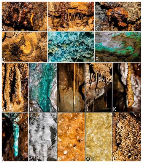 Secondary minerals forming speleothems, usually referred to as “cave minerals”, are the result of complex interactions between bedrock, circulating water, and sediments of various sources [1]. A “speleothem” is a secondary mineral deposit formed in a natural cave [2] by a chemical reaction from a primary mineral assemblage in bedrock or detritus because of a unique set of conditions therein. An identification name is awarded to each particular type of speleothem and the subdivision into types is mainly based on morphological and genetic characteristics [1]. Usually, different morphologies correspond to different genesis; however, there are cases where two different genetic mechanisms lead to two indistinguishable morphologies. In this case, the two speleothems are attributed to the same type, describing the different mechanisms of origin. On the other hand, it is impossible to originate different shapes by the same formation process. A speleothem that resembles a certain type, but has a different genesis, is assigned to a subtype [1]. Most speleothems typically form from the precipitation of CaCO3 (either calcite or aragonite) in caves developed in carbonate bedrock, but they can also be composed of other carbonates, oxides, hydroxides, sulfides, sulfates, phosphates, and silicates [1,3,4].