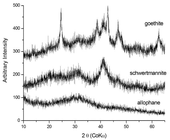 X-ray diffraction patterns of allophane, schwertmannite, and poorly crystalline goethite.