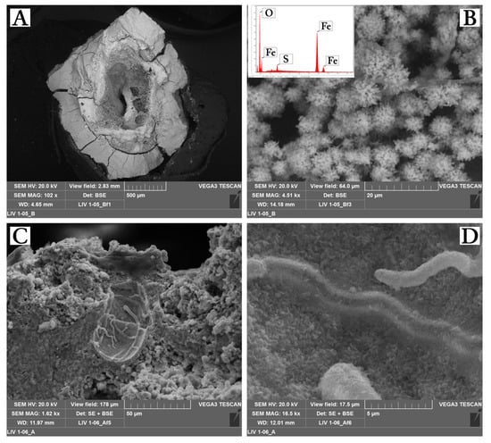 The XRPD results showed that schwertmannite and goethite were the main minerals occurring in gelatinous (jelly) and hard minothems. In order to understand the minerogenetic processes involved in the transformation between these two phases, cross-sections of jelly stalactites and hard stalactites were subjected to SEM investigations. All jelly stalactites and hard stalactites were characterized by concentric and rhythmic layers that develop around a large central feeding tube (Figure 4A). The inner zone is characterized by pin-cushion morphologies (Figure 4B), globular masses surrounded by radial fiber aggregates typical of schwertmannite and confirmed by EDS analysis. Images at high magnifications allowed identification of abundant bacterial structures (Figure 4C,D). The outer part was characterized by a compact zone with goethite grown in layers and with no signs of bacterial structures.