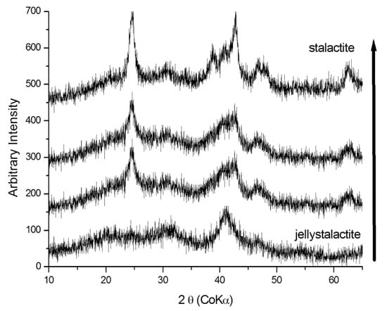 X-ray diffraction patterns for samples taken at different stages of evolution of representative samples of jelly stalactites (schwertmannite) and poorly crystalline goethite. The black arrow indicates schwertmannite into goethite transition.