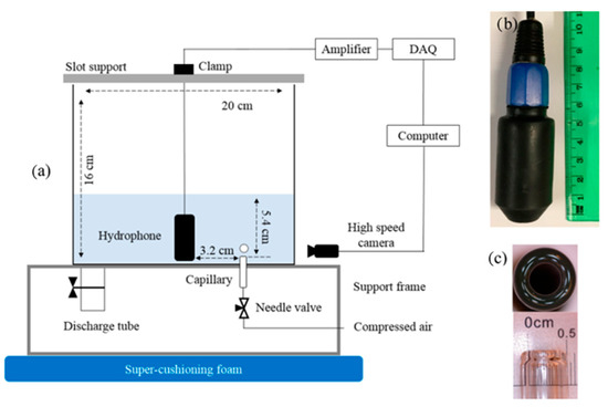 Experimental setup, adapted from Chu et al. (2017) [4]. Copyright 2017 ACS Publications. (a) overview of the entire setup, (b) hydrophone, and (c) capillary.
