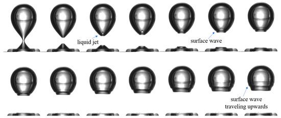 An example of a bubble breakaway in RO water is shown in Figure 2. The sequence shows that the breakaway generates two major phenomena. One is the rapid formation of a liquid jet immediately following the break of the thin air neck. The other is the formation of a surface wave, i.e., a capillary wave, as a result of the rapid dissipation of the liquid jet. This surface wave perturbates to the bubble surface, which travels upward along the bubble surface. The image sequence also shows that the surface wave travels at an exceeding velocity compared to the rising velocity of the air bubble, i.e., the air bubble barely moves within the time frame captured in Figure 2.