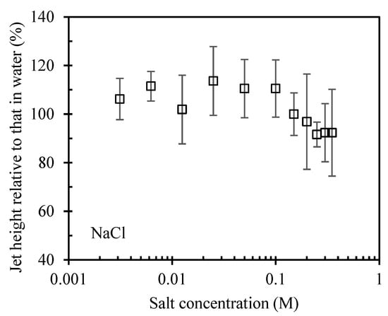 The effect of the salt type on the magnitude of the initial capillary wave is another observation in Figure 7b. It is noted that the minimum jet height is always associated with KCl, while the maximum is generally associated with Na2SO4 until, at higher concentration, it is taken over by MgCl2. The current experiment shows that each salt solution produces a unique jet height, hinting that the capillary wave is affected by the salt type. This is consistent with the observation by Chen et al. [27]. They conducted molecular dynamics simulations to study the effect of salt ions on the bending modulus of an air/water interface and found that the bending modulus is inversely related to the magnitude of the capillary wave fluctuation. Among the studied salts including NaCl, CaCl2, and MgCl2, they found that MgCl2 (0.5 M) produced the smallest bending modulus, implying that the presence MgCl2 triggered the largest capillary wave fluctuation. This is consistent with the observation in this work that MgCl2 at high concentration results in the largest jet height. With that, one can also rank the impact of the salts on the capillary wave fluctuations. For example, at the maximum concentration of 0.35 M tested in the present work, the order follows: MgCl2 (relative jet height is 99 ± 7%) > Na2SO4 (98 ± 11%) > NaCl (92 ± 18%) > CaCl2 (91 ± 6%) > KCl (83 ± 14%).