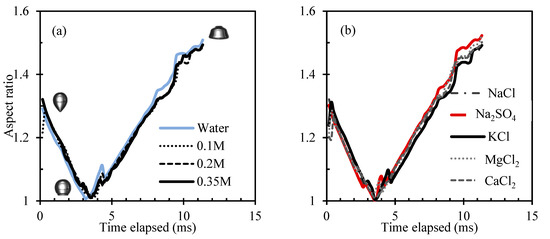 In understanding the impact of the salt type on the aspect ratio, this investigation has found that the potassium chloride and sodium sulfate, in general, produce the most prominent effect. Figure 4b shows the aspect ratio in 0.35 M salt solutions. The observation is that the maximum or minimum aspect ratio is almost always a result of either KCl or Na2SO4. During the first oscillation cycle, i.e., right after the breakaway but prior to aspect ratio 1 at, ca., 3.5 ms, the maximum aspect ratio is dominated by KCl, whereas the minimum is dominated by Na2SO4. As the oscillation continues, the trend reverses, and the difference becomes more profound as more time elapses.