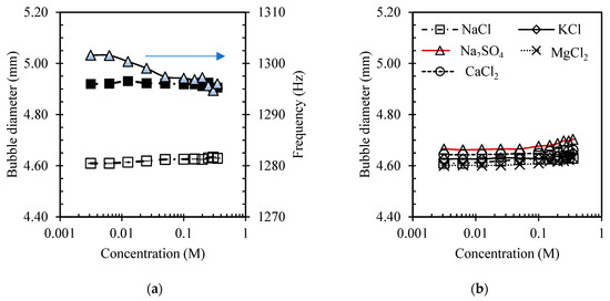 An example of the acoustic frequency in NaCl solutions is shown in Figure 5a. The figure also includes the bubble size calculated using the Minnaert relationship and that estimated from the image analysis. It is obvious that the increasing salt concentration reduces the acoustic frequency; however, the reduction is typically small. The other salts tested show a similar effect, though the degree of reduction may vary. The acoustic frequency in other salt solutions can be found in the Appendix A.