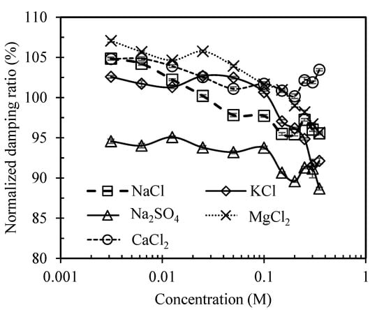 The normalized acoustic damping ratio (i.e., with respect to RO water) as a function of the salt concentrations is shown in Figure 6, where two general observations can be made. One is that all salts show a decrease in the damping ratio as the salt concentration increases. Though calcium chloride and sodium sulfate exhibit some adverse trends at their high salt concentrations, the overall decreasing trend for both salts is still valid. The other is that the chloride salts amplify the damping ratio beyond that of the RO water at their low salt concentrations, while sodium sulfate immediately diminishes it below. For example, at 0.00313 M, the initial increase in the damping ratio is about 7% for MgCl2, 5% for both CaCl2 and NaCl, and 3% for KCl, while the decrease is about 6% for Na2SO4.