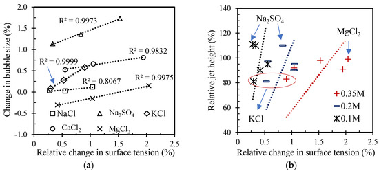 The current investigation only focused on single bubble formation via the break-up mechanism and the system did not involve the use of frothers. The results show that the presence of salts increases the bubble size produced, which appears to contradict the common observation made for bubble swarm systems. To explain the phenomenon, a re-visit to the fundamental break-up mechanism is necessary. Prior to break-up, an air/water interface must be deformed. This deformation results from the hydrodynamic stress in the liquid (e.g., turbulent eddies) and surface stress (e.g., surface tension) [23,24]. These stresses affect the interface in different ways—whereas the former tends to disrupt it, the latter attempts to restore and maintain a minimum surface area. Consequently, the competition between these actions determines the outcome of the break-up, such as the resulting bubble size [25]. In the current study, the hydrodynamic stress can be viewed as constant in all the tested solutions because a quasi-static condition has been precisely maintained. The only changing condition then can be assumed as the surface properties as a result of the presence of salts. Among different surface properties, this work focuses on the surface tension. It is well known that many salts, including most in the present study, generally increase the surface tension of water [2,16,19,26]. On this basis, it is reasonable to hypothesize that the increasing surface tension would result in a large bubble size because the interface has more strength to work against the external perturbation (i.e., hydrodynamic stress caused by the injected air) prior to its breakup. This hypothesis seems to be well supported by Figure 7a where the relative change in bubble size is plotted against that in surface tension, showing a unique linear relationship for each salt tested.