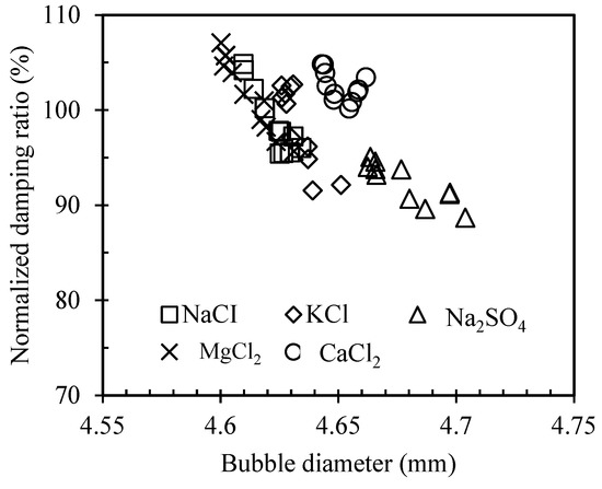 The analysis of the acoustic damping ratio shows that each salt is accompanied with a unique trend. Figure 6 shows that among all the salt solutions, Na2SO4 is generally associated with the smallest acoustic damping ratio. It has been understood that the acoustic signal emitted from a bubble is due to the volumetric pulsation of the entrapped air mass, and the acoustic damping ratio describes how fast the bubble sound decays [28,29]. It is also known from classical mechanics theory that the damping ratio is inversely related to the mass of the oscillating object [30,31]. Based on this, one can postulate that a system oscillating with a large mass should be accompanied with a smaller damping ratio, which seems to be the case for the present study. As summarized previously in Figure 5b, the Na2SO4 solution generally produces the largest bubble size, suggesting that the mass of the air that undergoes the acoustic oscillation in Na2SO4 solutions is largest. Therefore, the resulting acoustic damping ratio is smallest. Figure 8 provides more evidence to further support this argument. Regardless of the type of the salt, the observation is that a larger bubble is generally associated with a smaller acoustic damping ratio.