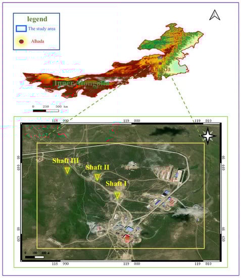 Location of the mining area. The upper portion represents the border of Inner Mongolia, China, and the background is the shaded DEM. The blue box indicates the study area. The lower portion is a satellite image of the mine area. The red triangles indicate the locations of shaft I, shaft II, and shaft III. (Satellite image is taken from Google Maps).