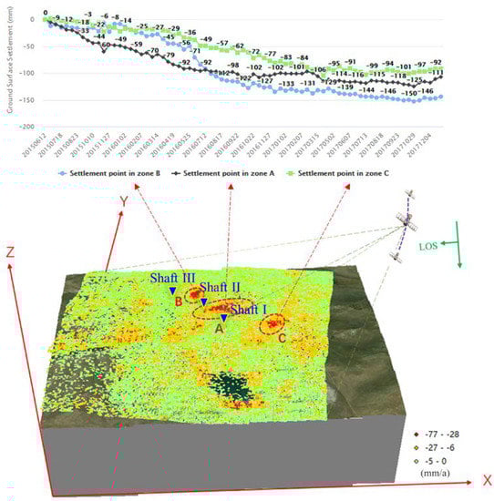 Figure 5 shows the subsidence-rate map of the mine area. There are three areas with large subsidence rates in the area, namely A, B, and C, which correspond to the areas with large subsidence on the cumulative subsidence map. The surface subsidence trend in the upper part of Figure 5 shows that the subsidence points located in the three subsidence centers of A, B, and C all exhibit a significant and continuous decline. The cumulative deformation of the selected point in subsidence area A is approximately −111 mm, and the average annual subsidence rate is −45 mm/a; the cumulative deformation of the selected point in subsidence area B is approximately −146 mm, and the average annual subsidence rate is −59 mm/a, and the cumulative deformation of the selected point in subsidence area C is approximately −92 mm, and the average annual subsidence rate is −37 mm/a. The maximum annual average rate of subsidence in the mine area is estimated to be −77 mm/a.