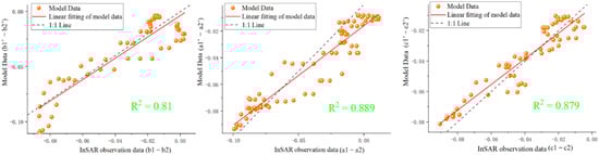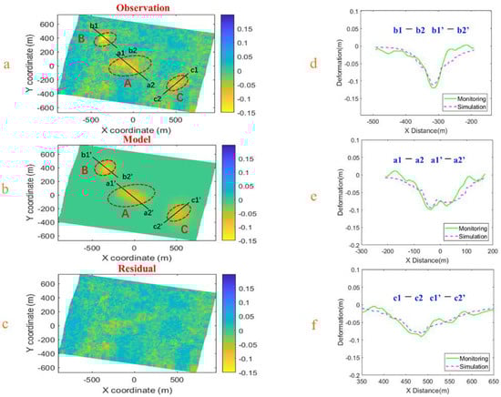 On the basis of the InSAR observations, the ore-body parameters leading to surface subsidence of Pb-Zn mining were inverted using the multi-source Okada model [31]. As shown in Table 1, the original inversion parameters of the model were set for the inversion and surface-subsidence simulation based on the mine information and InSAR results. According to Table 2, the optimal-model ore-body parameters for subsidence zones A, B, and C were obtained and established in the Cartesian coordinate system. The surface subsidence of subsidence zone A is mainly caused by the change in the finite rectangular source (i.e., the underground mined ore body) at the coordinate position (−83.37 m East, −101.67 m North) and at a depth of 94.51 m; the surface subsidence of subsidence zone B is mainly caused by the change in the finite rectangular source at the coordinate position (−331.89 m East, 336.53 m North) and at a depth of 106.69 m; the surface subsidence of subsidence zone C is mainly caused by the change in the finite rectangular source at the coordinate position (441.87 m East, −310.27 m North) and at a depth of 153.91 m. From Figure 6a,b, it can be seen that the morphology of subsidence zones A, B, and C obtained via InSAR observation is consistent with that simulated by the model. Figure 6c shows the residual plots, and it can be seen that the residual values are small, indicating that the modeled deformation is accurate. We further compare the InSAR observed deformation with the simulated deformation via three profiles, as shown in Figure 6d–f. The solid green lines represent the InSAR observation data, which correspond to the a1-a2, b1-b2, and c1-c2 profiles, respectively, while the purple dashed lines represent the simulation data, which correspond to the a1′-a2′, b1′-b2′, and c1′-c2′ profiles, respectively. The correlation analysis between the InSAR observations and the simulation results is shown in Figure 7, in which the solid red lines represent the linear fit of the model and the black dashed lines represent the 1:1 line. The calculated R2 = 0.81 for the subsidence zone B profile (b1-b2, b1′-b2′), R2 = 0.889 for the subsidence zone A profile (a1-a2, a1′-a2′), and R2 = 0.879 for the subsidence zone C profile (c1-c2, c1′-c2′). The high correlation indicates that the parameters of the model inversion are accurate.