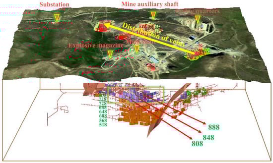 We utilized the probability integral method to predict the maximum surface subsidence in the Alhada Pb-Zn mine. Due to scattered distribution of the metal ore deposit, the theoretical calculations using the probability integral method require the deletion and consolidation of the ore bodies. The Alhada Pb-Zn mine was created in 2005 and was mined without filling the voids during the early stage. The void extraction area has been gradually filled since April 2015. The two cases, i.e., mining the two middle sections together and mining them separately without filling, can be considered approximately equivalent. The mined ore bodies for the calculation of the predicted deformation values were considered fully mined. The ore body of this mine from the 848 middle section and 808 middle section along the strike length is ls = 1266 m, the inclination length is lE = 120 m, the thickness of the ore body is M = 4.5 m, the average dip angle is approximately α = 32°, the burial depth of the lower boundary of the ore body is H1 = 192 m, the upper-boundary burial depth is H2 = 118 m, and the average burial depth is Hm = 155 m.