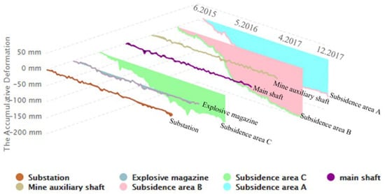 The CS-InSAR technique was applied to monitor the surface deformation over a long time period and obtain the surface-deformation results in the line-of-sight direction. As shown in Figure 4, time-series cumulative subsidence maps were generated, and all the subsidence maps show cumulative deformation relative to the starting time of 12 June 2015. The warm colors in the figure represent the location with a high amount of subsidence, wherein red is the location with the highest amount of subsidence, and the cool colors represent the locations with no subsidence or a low amount of subsidence. With the increase in mining time, several subsidence areas of different scales have appeared in the mine area, and the subsidence areas are not uniform in spatial distribution. We can see that there are three main surface subsidence areas in the mine area: area A, area B, and area C. Among them, area A is located near Shaft I in the middle of the mine area, area B is located between Shaft II and Shaft III in the western part of the mine area, and area C is located near the drill-core store in the eastern part of the mine area. Throughout the monitoring period, surface subsidence persisted in areas A, B, and C, and the amount and extent of subsidence continually increased. Among them, the surface subsidence in area A developed earliest and was the widest, followed by area B and area C. Although the development of subsidence in area B was relatively late, the rate of subsidence was faster. The maximum accumulated subsidence in the mine area is −164 mm.