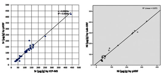 Favorable correlation between the data of strontium in a sandstone obtained by pXRF onsite in the field and by ICP-MS in a laboratory and Ni by pXRF in the field and XRF in a laboratory [17,18].