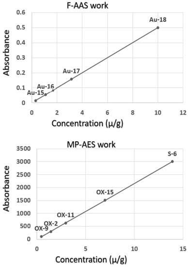 Calibration curves are commonly generated in two ways: (i) using synthetic single or multi-element solutions of progressively increasing concentrations, and (ii) using matrix-matching CRMs with a reasonable spread in the analyte concentration. To verify the robustness of these calibration curves, a couple of CRMs can also be run as unknowns in the analytical sequence and check the data by comparing with certified values for different elements, and this comparison gives a direct measure of the accuracy of the method utilized. Figure 2 presents calibration curves generated using matrix-matched reference materials for the determination of gold by F-AAS and MP-AES work to minimize matrix interference effects [65,66].