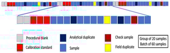 Duplicates in geochemical investigations are of two types: field duplicates (splits of drill core or collected within a given distance from the original sample), and laboratory duplicates which are used to quantify the total sampling, and preparation precision and the laboratory duplicates to provide analytical precision. The analytical replicates and field duplicates are inserted to assess the overall precision of the analytical results individually for each element and to calculate the practical quantification limit (PQL) for each element analyzed. The procedural blanks are used to monitor contamination and to perform necessary corrections. Check samples or control samples are used to monitor accuracy. Figure 3 shows an example of the analytical sample sequence followed in our laboratory for the geochemical analysis by HR-ICP-MS [59]. By inserting CRMs in sample sets, the researcher can assess and establish the accuracy of the analytical results for the unknown samples.