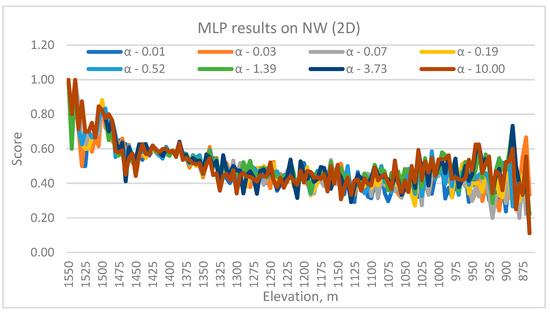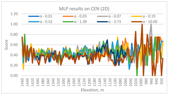 Two things are immediately apparent from Figure 1. One, the MLP classifier performed much better at 1550–1500 elevations than everywhere else. Generally speaking, the performance appeared to drop with depth. The average score was 0.76 in the 1550–1500 m elevation range. Second, α impacts performance but there is no clarity on any specific value. The best performance is 1, implying a 100% prediction accuracy. However, that is not particularly impressive as there were just four samples in the test case at that elevation since these elevations represent a hill.