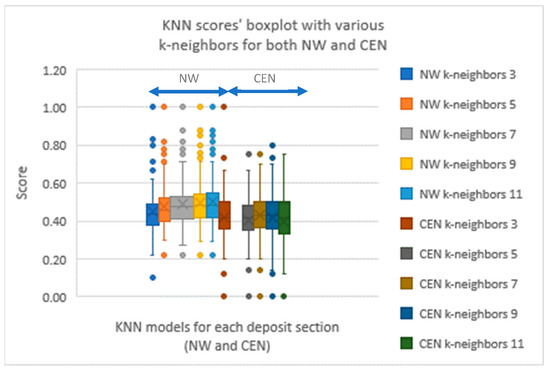 Box plots of results in various k-numbers on KNN performance in both NW and CEN.