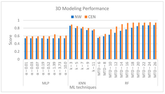 In 3D modeling, the entire space could be modeled at once, and thus, results could be presented much more elegantly. In 2D, there were over 100 slices in each area which complicated the presentation of results. Figure 7 shows the results for MLP, KNN and RF for NW and CEN areas. It is clear that RF and KNN performed much better than MLP and much better than in the 2D case. MLP also performed better than the 2D case. Performance in the CEN deposit reached 0.95 and was better than in the NW deposit, where the highest score was 0.88. RF outperformed KNN in both deposits by a small margin. The best tree depth was 24, and the best neighborhood size was 3. The smaller neighborhood size makes sense given the tree depth. As trees get deeper, the bottom leaves would not have that many samples.