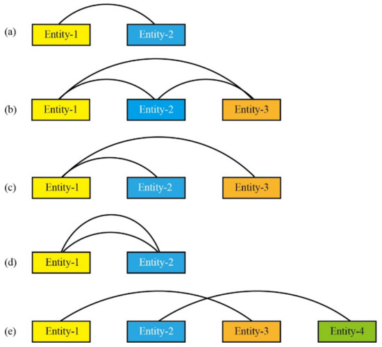Diagram of the types of relations: (a) binary relation; (b) N-ary relation; (c) single-entity overlapping relation; (d) entity pair overlapping relation; (e) cross relation.