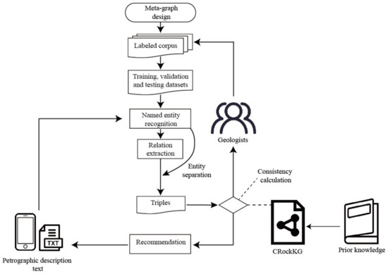 Due to the growing availability of massive earth observation data, the research on and application of artificial intelligence technologies, such as knowledge graphs (KGs), machine learning and deep learning, are receiving increasing attention [1,2,3] in the solid earth [4], remote sensing [5], geological image recognition [6,7,8] and metallogenic process [9] domains. In response to the rapidly increasing and varying types of filed data, scholars have proposed that studies should be guided by big data thinking and techniques commonly applied in deep information mining, such as hidden-mode processes, unknown correlations or other useful information that could be leveraged for decision making [10,11]. Meanwhile, the geological data tend to be uncertain, sparse, multiresolution and multiscale and need knowledge-rich intelligent systems for processing [12,13,14,15,16]. Among these approaches, machine reading based on natural language processing [17,18,19,20] and domain-specific KGs of geosciences [21,22,23,24] have also attracted increasing attention from geologists.