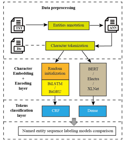 In this paper, the sequence labelling method is also adopted. Based on the labelled corpus of petrographic descriptions, the comparative experiments between bidirectional RNN models (BiLSTM-CRF and BiGRU-CRF) and pre-training Chinese models (BERT, ELECTRA, XLNet) were carried out to determine which model is suitable for NER of petrographic descriptions. The comparison processes for the rock named entity sequence labelling models is shown in Figure 4. The petrographic description texts are first labelled and saved as ANN format files and then tokenised at the Chinese character level. ANN is the file format of the BRAT (Brat Rapid Annotation Tool) [46]. The character-level representation of the input sequence is completed via an embedding layer, and the feature extraction is realised through an encoding layer. The token classification layer is finally used to determine the probability of each entity type. Models based on RNNs adopt a randomly initialised embedding layer and a CRF classification layer. However, the models based on pre-trained models only require fine-tuning of the dense layer.