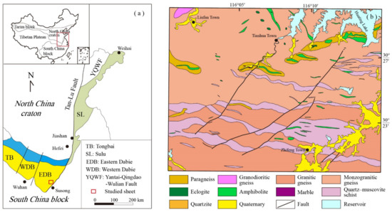 (a) Schematic tectonic map for the Dabie-Sulu orogenic belt in central and eastern China, showing the location of the 1:50000 Fengxiangyi sheet. The inset shows the major tectonic divisions of China (modified after Qiu et al., 2021 [52]); (b) simplified geological map of the Fengxiangyi sheet, showing the distribution of rocks.