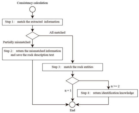 Figure 7 shows the calculation process applied for knowledge alignment. The first step is the consistency calculation of the extracted texture, structure and mineral composition information. Based on the extracted rock type, Cypher, a graphic query language, is used to match the extracted textures, structures, major minerals and minor minerals with their corresponding information of this rock type in the KG one by one. To evaluate the matching results of step 1, if there are mismatched extraction knowledge triples, step 2 is executed. If all triples match, the algorithm proceeds to step 3. The unmatched triples of step 2 may be an error description or new knowledge, and the program returns the mismatch information. At the same time, the program automatically saves the rock description text to the corpus, which should be manually verified. Step 3 involves matching the rock entity extracted from the rock description text with the rock entities in the petrographic KG, which conform to the characteristics of the extracted texture, structure, major minerals and minor minerals. The output of this step is the number of rock entities that match the description. The process is terminated if only one match is found; if two or more entities are returned in step 3, then step 4 is executed. In step 4, the program indicates that there are some rock entities with the same descriptive characteristics. The knowledge identified between the rock entities is returned. This step plays the role of knowledge recommendation while conducting the consistency calculation.