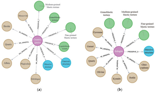 As an example, in Table 2 the rock description text for a granitic gneiss outcrop is presented. The extracted rock entity name, structure entities, texture entities and mineral entities, along with the relations of the major and minor minerals, are described. Figure 8a is the subgraph for granitic gneiss. The consistency calculation for the extracted triples went through steps 1 and 3. In the petrographic KG, only granitic gneiss has the same characters extracted from the rock description text. Table 3 is the rock description text for another eclogite outcrop, and Figure 8b is the subgraph of the petrographic KG for eclogite. The consistency calculation after knowledge extraction also involves the execution and termination of steps 1 and 3.
