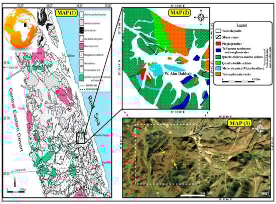 Map (1) Geological map for the Central Eastern Desert of Egypt, showing the Neoproterozoic basement rocks (modified from CONOCO map 1:500,000 and compiled from two quadrangle maps: Quseir quadrangle NG 36 NE and Gabal Hamata quadrangle NG 36 SE). Map (2) Detailed geologic map of the western part of Abu Dabbab area (modified after [31]). Map (3) The Google Earth imagery of Abu-Dabbab region; the yellow arrows are pointed to the plagio-granite location (central left).