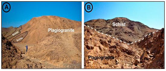Field photographs of plagio-granite blocks encountered in Wadi Abu Dabbab. (A) Highly weathered plagio-granites. (B) Jointed plagio-granites intruded within volcaniclastic metasediments at Wadi Abu Dabbab.