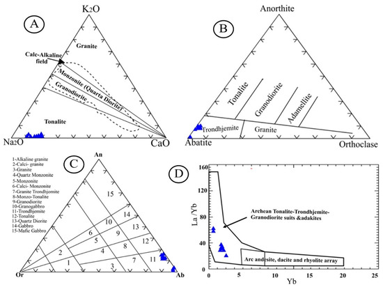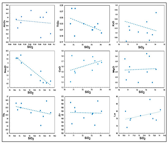 The abnormal SiO2, Na2O, and CaO contents in plagio-granite samples could be referred to as the effect of alteration processes such as albitization, silicification, and carbonation [9]. Many authors such as [50]; Refs. [50,51] have distinguished between: